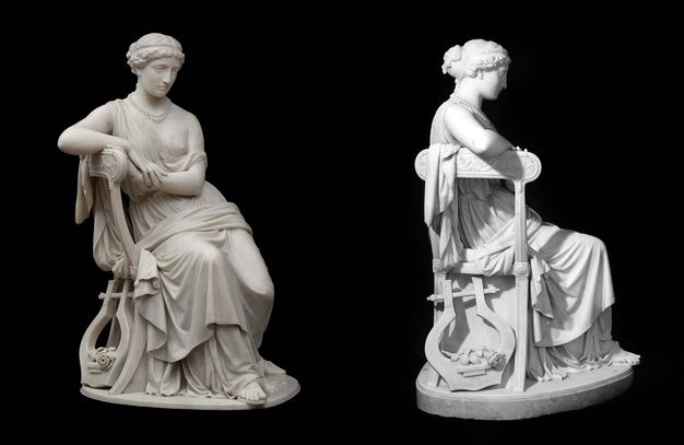 This range demonstrates an extraordinary scope of reference, indicating the magnitude of the research that lay behind the service. Each portrait appears to have had an existing basis. Some are well known and have numerous manifestations; others are more mysterious, and we were unable to find a source for Murasaki. Several show striking similarities to famous portraits from Western art, and were, in all likelihood, consciously based on these works—for example, Piero di Cosimo’s Simonetta Vespucci (ca. 1480), Peter Lely’s Nell Gywnn (ca. 1675), Louise Elisabeth Vigée Le Brun’s Marie Antoinette dite*** ****"à la Rose" *(1783), and Thomas Gainsborough’s Mrs Siddons (1785) (Figs. 9, 10, 11, 12). The artists also looked to a wide range of media, such as the mosaic of Empress Theodora from the Basilica San Vitale, Ravenna; the sculpture of Sappho by Pierre-Nicolas Beauvallet (1813); and the engraving of Pocahontas by Simon van de Passe (ca. 1616) (Figs. 13, 14, 15, 16, 17, 18).