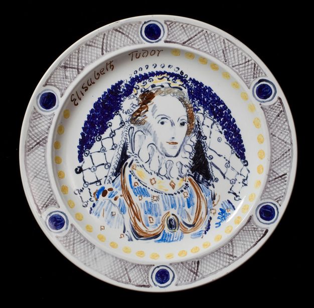 By contrast, manufacturing the Famous Women service necessitated an involved process that took more than a year to organize and complete. It was facilitated by Billy Winkworth, a ceramics collector and connoisseur, who was a mutual friend of the Clarks and the Charleston artists and made introductions to Wedgwood. The artists travelled to Stoke-on-Trent as the guests of Josiah Wedgwood V, where they toured the Etruria factory, and spent a day “looking at all the different shapes, glazes & colours in the Wedgwood pottery.”15 They selected a blank shape called the “concave pattern, that is a plain round plate with a slightly concave edge” for its “very practical” qualities; and a “grey body, which when it has a transparent glaze on it is a lovely cool white very like Delft.”16 Their choices of a fairly chunky shape, similar to those used for Omega ware, with an iconic finish suggests a self-conscious recourse to the history of fine dining combined with an ever-present spirit of subversion—a marriage of tradition and modernism, craft and high art (Figs 5, 6, and 7).