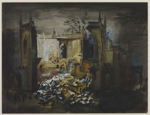 46At the same time, visualisations of the war’s destructive effects were conditioned by psychological responses to trauma. As historians Susannah Biernoff and Sue Malvern have argued in relation to the First World War, theories of trauma and disgust show how viewers are often unable to confront mortality and the abject nature of the corporeal body in injury and death.49 In war art, injury and the loss of life are therefore frequently visualised metaphorically. In the case of the Blitz, this was achieved, as Foss argues, by painting ruins that could “act as a visual surrogate” for the human casualties, thus displacing bodily trauma onto architecture.50 As he has shown, this displacement centres on public and religious buildings in particular, as in works such as Piper’s All Saints Chapel, Bath (1942) (fig. 9). Ruins could symbolise the spiritual and cultural attacks that Britain experienced and so foster a sense of national outrage, yet at the same time were unlikely to be inhabited and were therefore less likely to draw attention to any civilian loss of life.51 Interestingly, this phenomenon was also evident in corresponding painting in Germany, which featured what John-Paul Stonard refers to as “martyred architecture”.52
