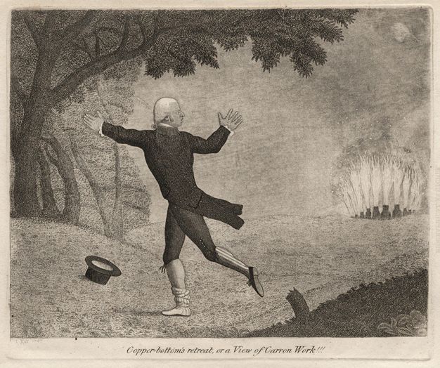 5During the period of social unrest provoked by the passing of the Scottish Militia Act (1797), Kay created Copper-Bottom’s Retreat, or a View of Carron Work!!!, a satirical etched portrait of William Forbes of Callendar (1743–1815) (fig. 1). Duncan Thomson and Lynne Gladstone-Millar described this as a “naïve, but amusing, print”, and found Kay’s “little etched portraits” to be “lively and humorous but entirely unsophisticated”.7 Conversely, following Ian Haywood’s point that “the intervisual richness of caricatures is often underestimated by critics”, this article’s analysis challenges such assumptions about Kay, and demonstrates that Copper-Bottom’s Retreat presents a carefully constructed mock-heroic burlesque.8