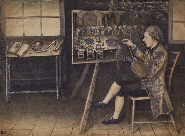 51In England, Jonathan Richardson’s Essay on the Theory of Painting (1715) promoted the Raphael cartoons as exemplars of invention, expression, and composition, while in Scotland, George Turnbull’s Treatise on Ancient Painting (1740), described them as “sublime, divine pieces” with the capacity “to tell an instructive or moving Story in the most agreeable and lively manner”.53 Hogarth’s etching Characters and Caricaturas (1743) promoted the Raphael cartoons as epitomes of the natural expression of character, contrasting three “characters” from the cartoons with four distorted “caricaturas” copied after Pier Leone Ghezzi, Annibale Carracci, and Leonardo da Vinci (fig. 5). A pictorial reference to this work sits on Kay’s worktable in his painted self-portrait Kay Painting the Barbers’ Dinner (circa 1788) (fig. 6) and in his etching William Martin, Auctioneer in Edinburgh (1784), the multiple heads of his print-viewing audience clearly reference those in the upper register of Hogarth’s print (fig. 7).54
